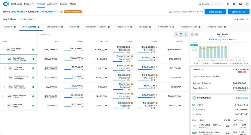 - Deal Management: Clari helps sales reps manage accounts, spot risk, and take action. The AI-driven health scores let you allocate your time effectively, focusing on the areas you need the most.